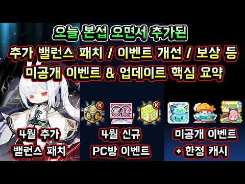 [메이플스토리 맑음] 오늘 본섭 오면서 추가된 / 추가 밸런스 패치 / 이벤트 개선 / 미공개 이벤트 / PC방 이벤트 / 한정 캐시 등 / 미공개 업데이트 & 이벤트 핵심 요약